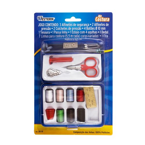 | Mais Informações | - Dimensões da Peça: • 3 Alfinetes de segurança: 2,9 cm x 3,6 x 3,6mm. • 2 Alfinetes de pressão: 2,7 cm x 5,9 x 5,9mm. • 2 Colchete s de pressão: 8,5 x 8,5 x 8,5mm. • 4 Botões 10 x 10 x 10mm. • 1 Tesoura: 5,6 x 3,6 cm x 3,1 x 3,1mm. • 1 Passa linha: 4,2 x 1,6 x 1 ,1cm. • 1 Estojo com 4 agulhas.4,2cm x 7,1 x 7,1mm. • 1 Dedal: 1,8 x 1,6 x 1,6cm. • 7 Linhas para costura (5,5 mm cada) cores variad as. • 1 Fita métrica 64cm. - Dimensões da Embalagem: 15,5 x 2,9 x 24,5cm |