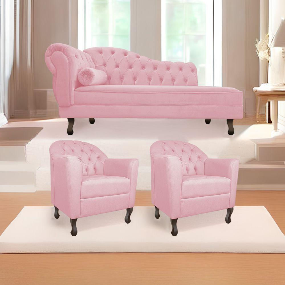 Kit Diva Recamier Diana 130cm Lado Direito E 02 Poltronas Julia Suede - Adj Decor Cor Rosa Bebê