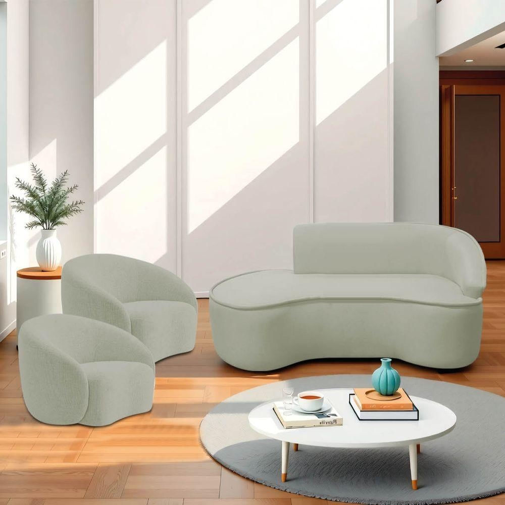 Kit Divã Recamier Orgânico Marrocos 160cm Lado Esquerdo E 2 Poltronas Amore Bouclé Verde Oliva