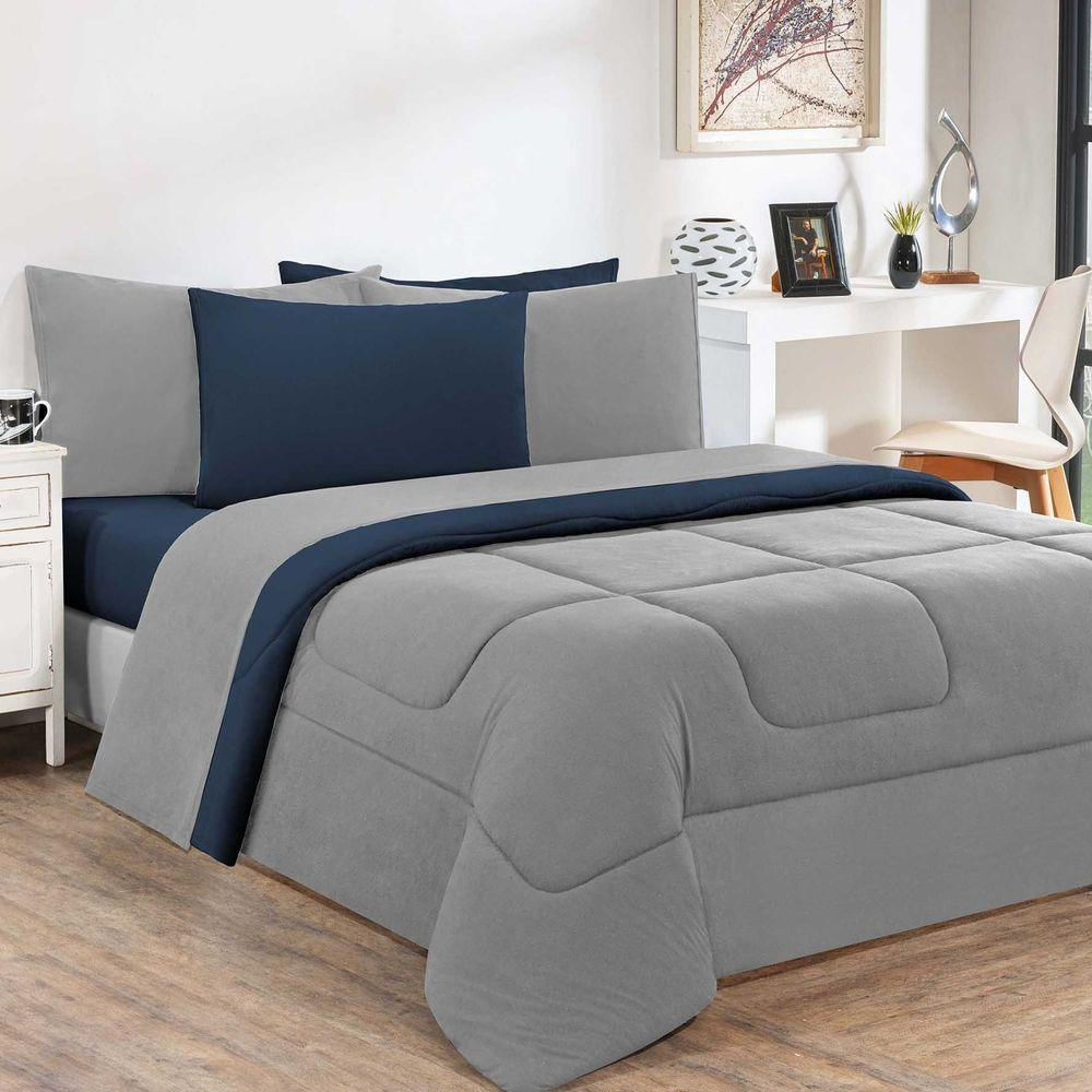 Kit Edredom + Jogo De Lençol 100% Algodão Gran Moratta 7 Peças Queen Cinza-azul Marinho