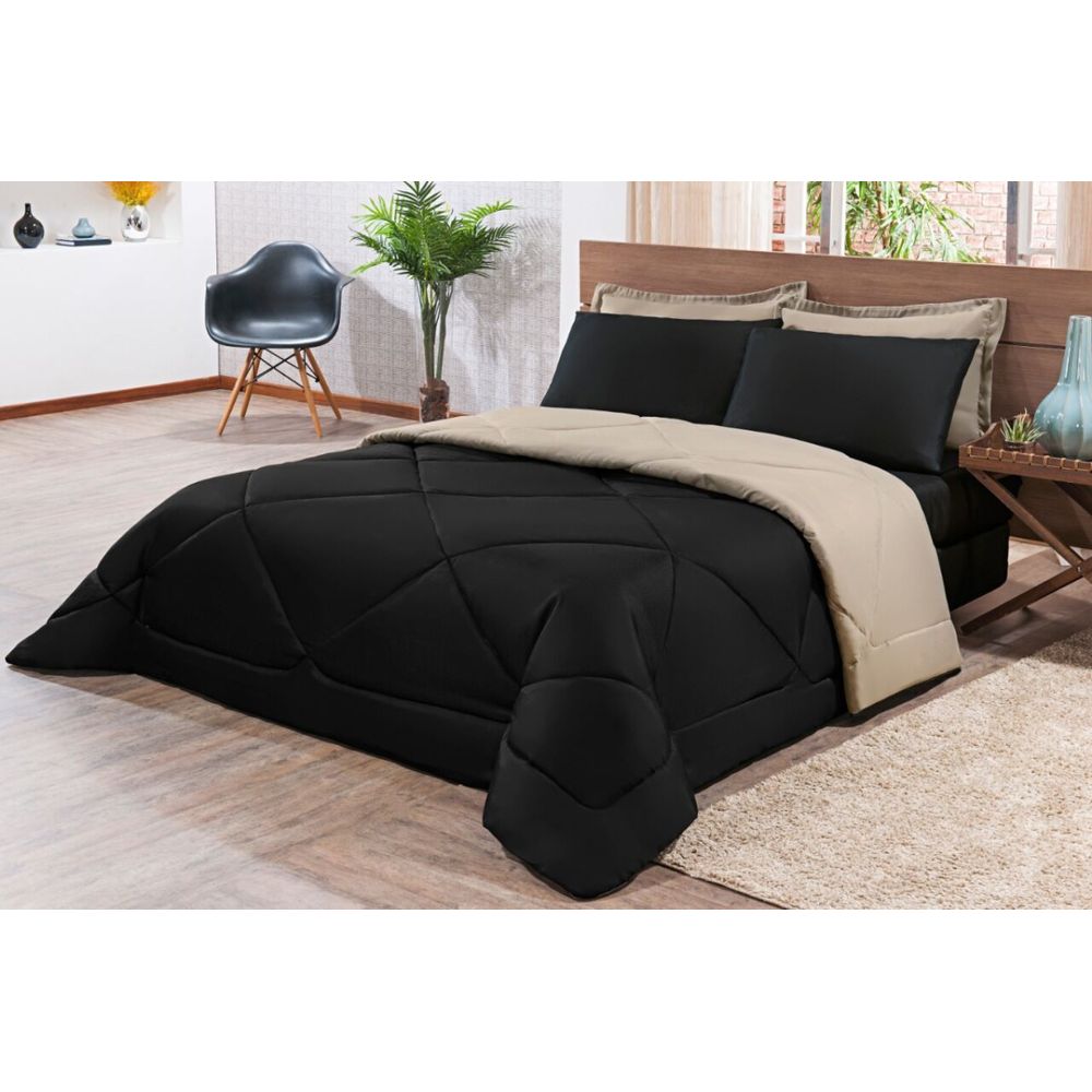 Kit Edredom + Jogo De Lençol Aconchego Look House Dupla Face Casal King 06 Peças - Preto E Caqui
