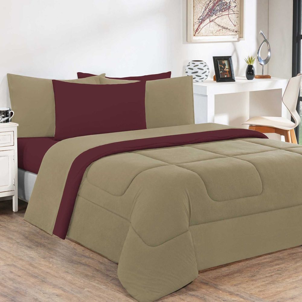 Kit Edredom + Jogo De Lençol Malha 100% Algodão Gran Moratta 6 Peças Queen - Avelã/Vinho