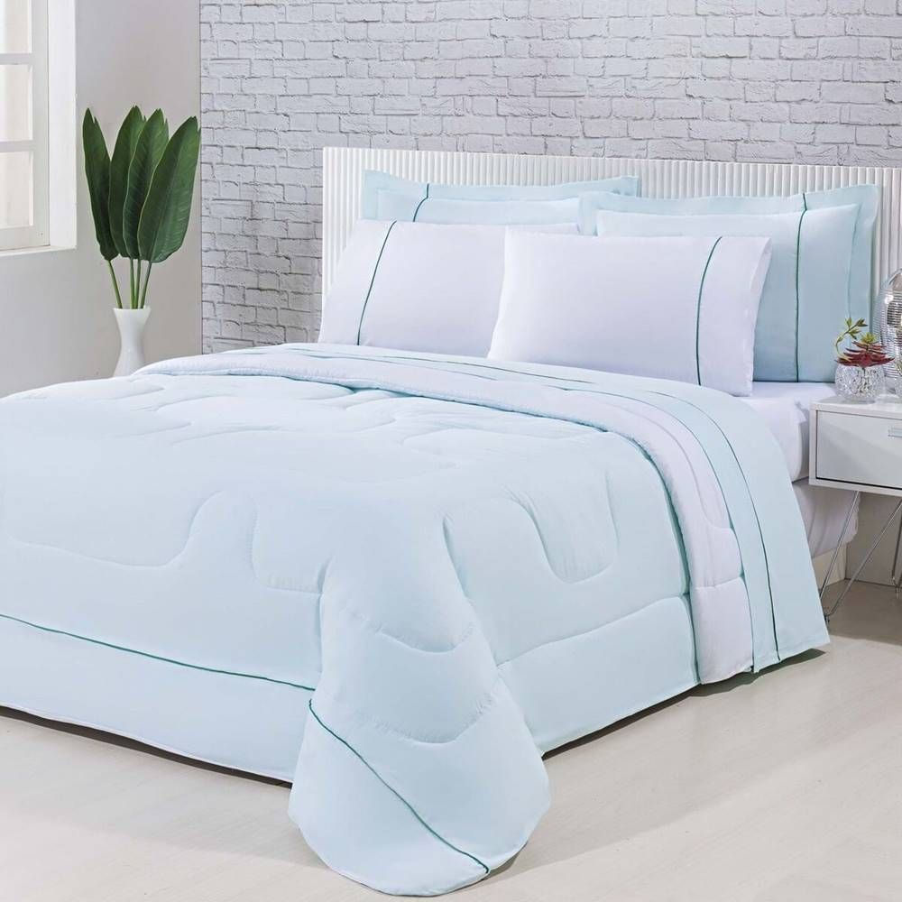 Kit Edredom 100% Algodão Percal 150 Fios Dupla Face King + Jogo De Cama Gran Moratta 7 Peças - Branco/ Verde