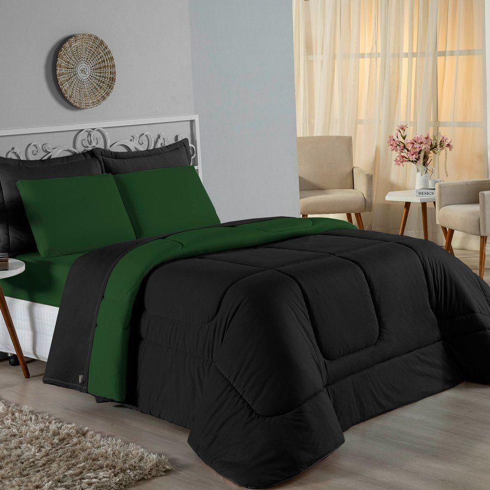 Kit Edredom Dupla Face + Jogo De Lençol Casal Nobre 6 Peças Malha 100% Algodão - Preto / Verde-bandeira