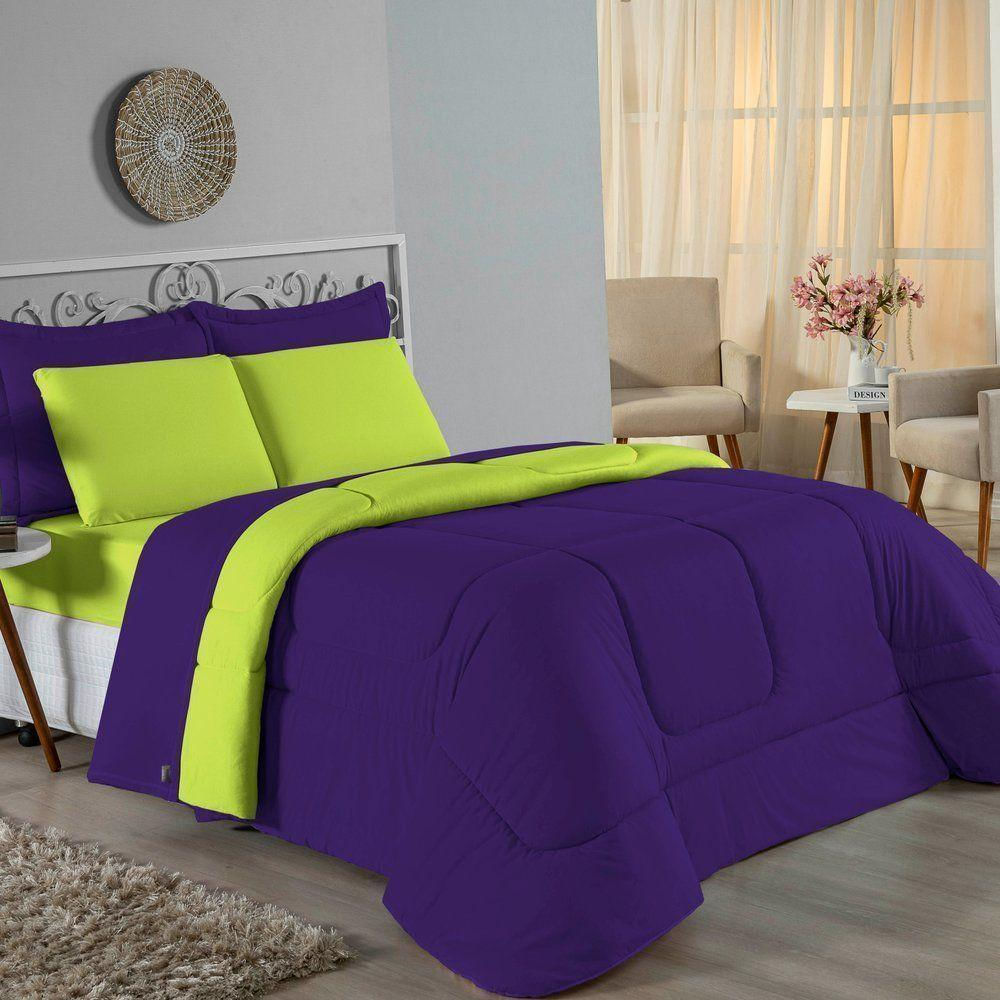 Kit Edredom Dupla Face + Jogo De Lençol Casal Nobre 6 Peças Malha 100% Algodão - Roxo / Pistache