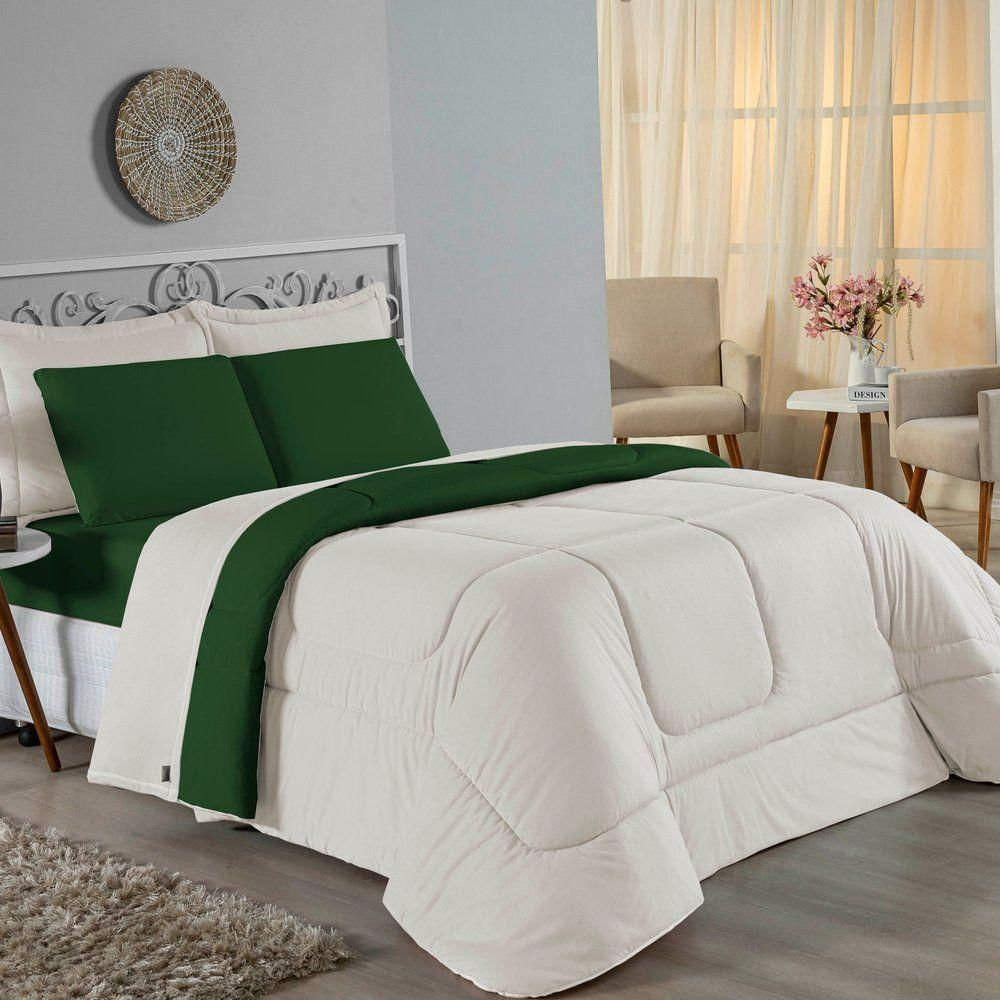 Kit Edredom Dupla Face + Jogo De Lençol Casal Viúva Nobre 6 Peças Malha 100% Algodão - Palha / Verde-bandeira