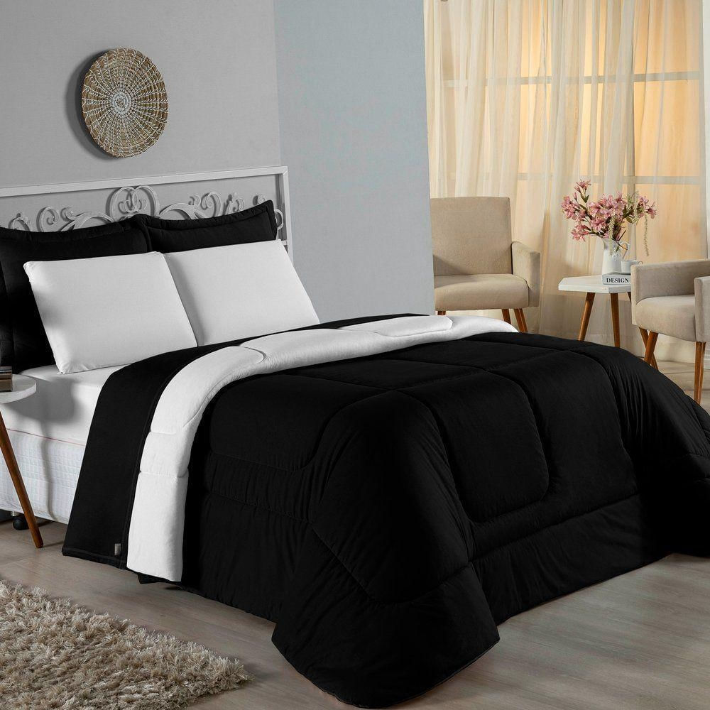 Kit Edredom Dupla Face + Jogo De Lençol Casal Viúva Nobre 6 Peças Malha 100% Algodão - Preto / Branco