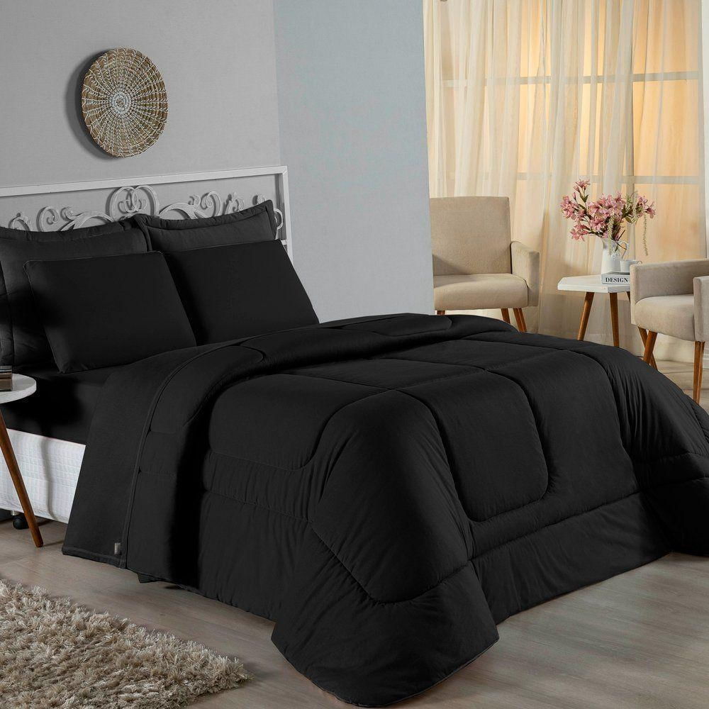 Kit Edredom Dupla Face + Jogo De Lençol Casal Viúva Nobre 7 Peças Malha 100% Algodão - Preto