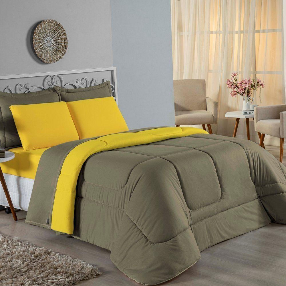 Kit Edredom Dupla Face + Jogo De Lençol King Nobre 6 Peças Malha 100% Algodão - Avelã / Amarelo