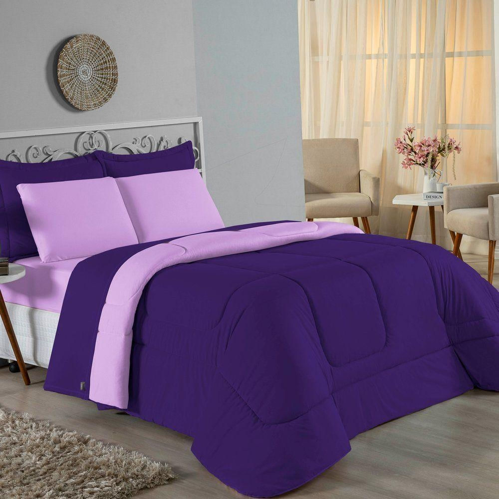 Kit Edredom Dupla Face + Jogo De Lençol Queen Nobre 6 Peças Malha 100% Algodão - Roxo / Lilás