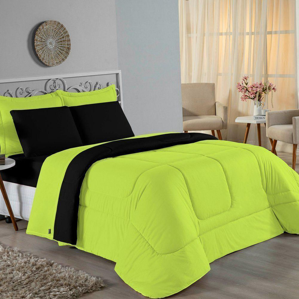Kit Edredom Dupla Face + Jogo De Lençol Queen Nobre 7 Peças Malha 100% Algodão - Pistache / Preto