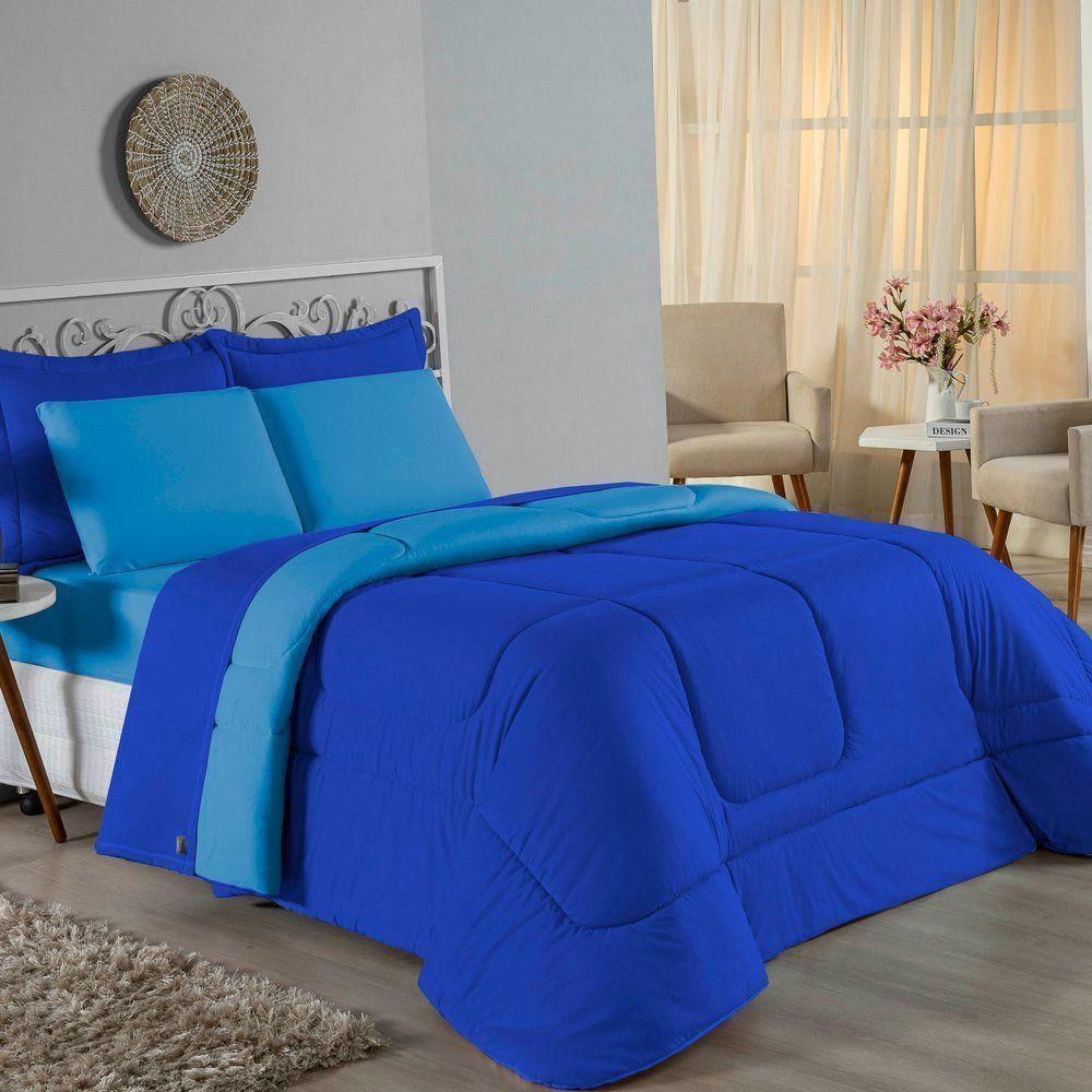 Kit Edredom Dupla Face + Jogo De Lençol Queen Nobre 7 Peças Malha 100% Algodão - Royal / Turquesa