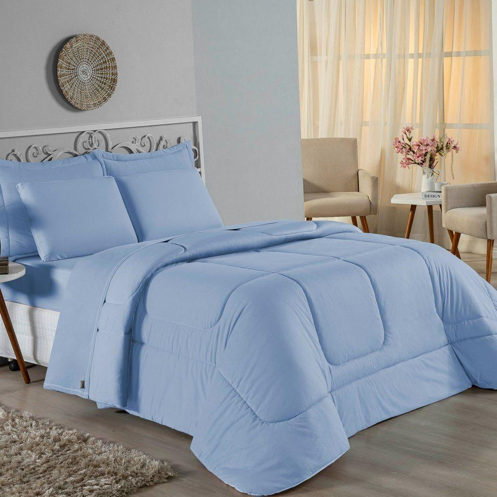 Kit Edredom Dupla Face + Jogo De Lençol Solteiro Nobre 5 Peças Malha 100% Algodão - Azul-bebê