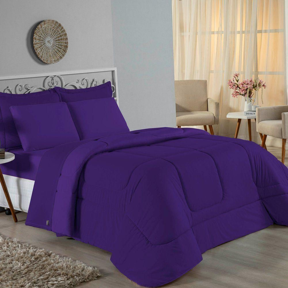 Kit Edredom Dupla Face + Jogo De Lençol Solteiro Nobre 5 Peças Malha 100% Algodão - Roxo