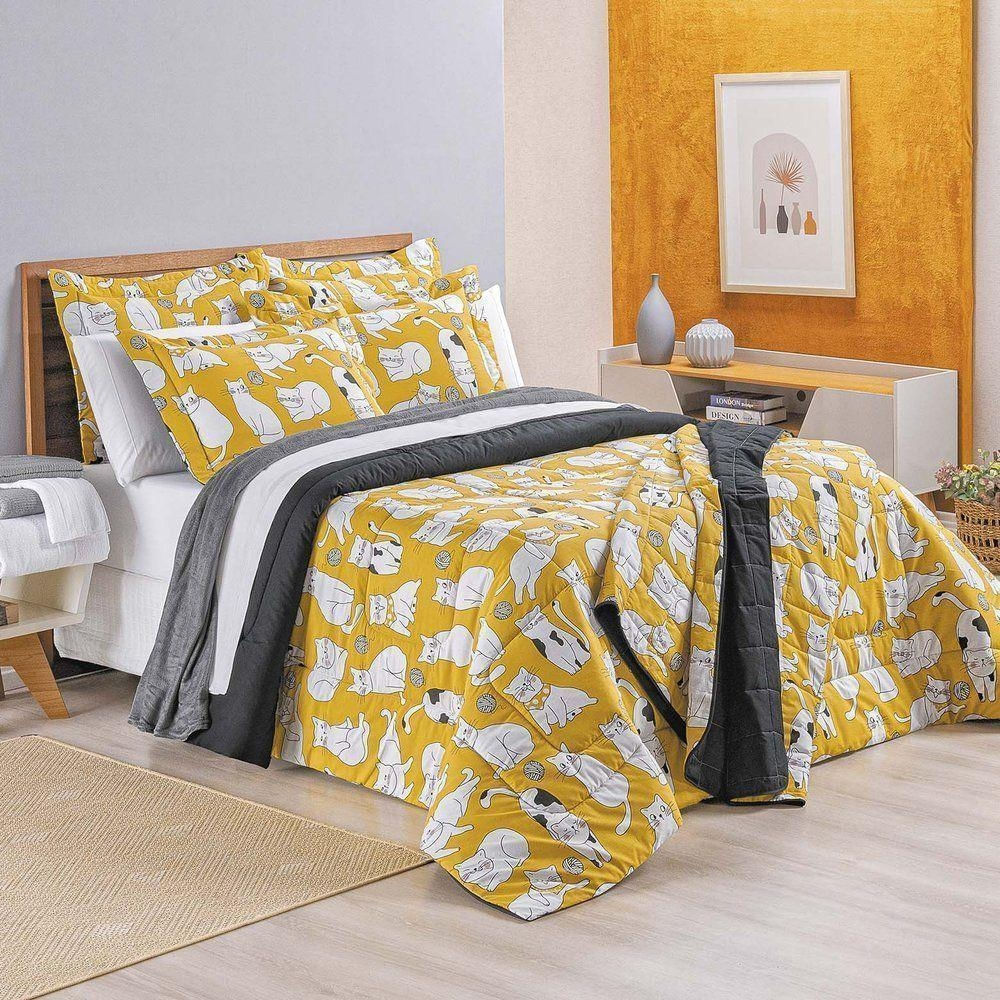 Kit Edredom New Cats Casal Padrão 3 Peças Percal 150 Fios 100% Algodão - Estampa Gato