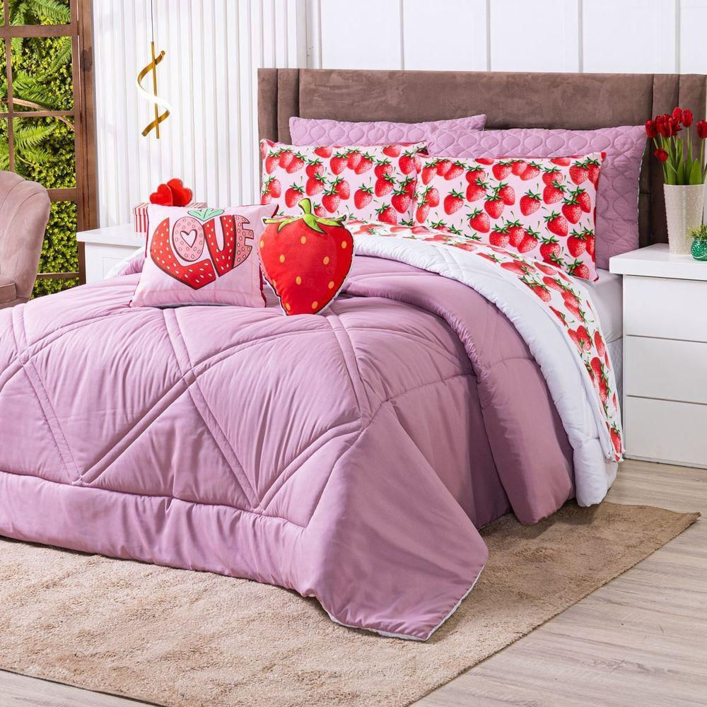 Kit Edredom Solteiro Morangos Rosê Com Almofadas Estampadas 05 Peças - Dupla Face Percal 300 Fios