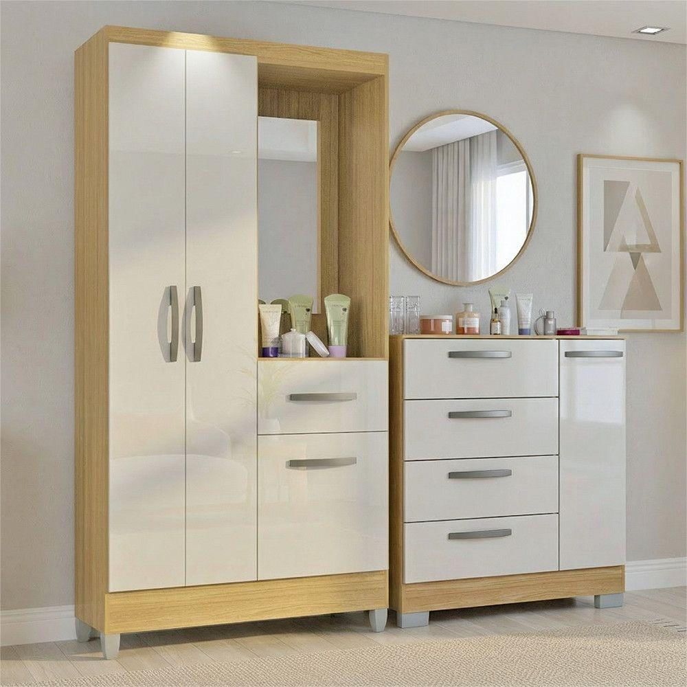 O Kit Guarda-Roupa Atlas com Comoda Elena Poquema e ideal para quem busca mais organizacao, praticidade e harmonia no quarto. O conjunto reune dois moveis funcionais que otimizam o espaco e facilitam o dia a dia, oferecendo solucoes eficientes para guardar roupas, acessorios e objetos pessoais. O guarda-roupa com espelho integrado contribui para a rotina diaria e amplia visualmente o ambiente, enquanto a comoda complementa o conjunto com excelente capacidade de armazenamento. Um kit pensado para tornar o quarto mais organizado, funcional e bem planejado. Caracteristicas: Kit composto por guarda-roupa e comoda Produzidos em MDP de 12 mm Acabamento em pintura U.V. Guarda-roupa com 03 portas Guarda-roupa com 01 gaveta Guarda-roupa com espelho integrado Cabideiro em madeira Comoda com 01 porta Comoda com 04 gavetas Dobradicas metalicas Corredicas metalicas Puxadores plasticos Pes plasticos Produto entregue desmontado Montagem por conta do cliente