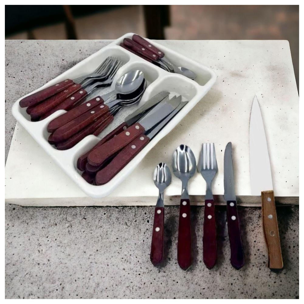 Composição do kit: Facas, garfos, colheres de mesa e colheres de sobremesa com porta talher em madeira