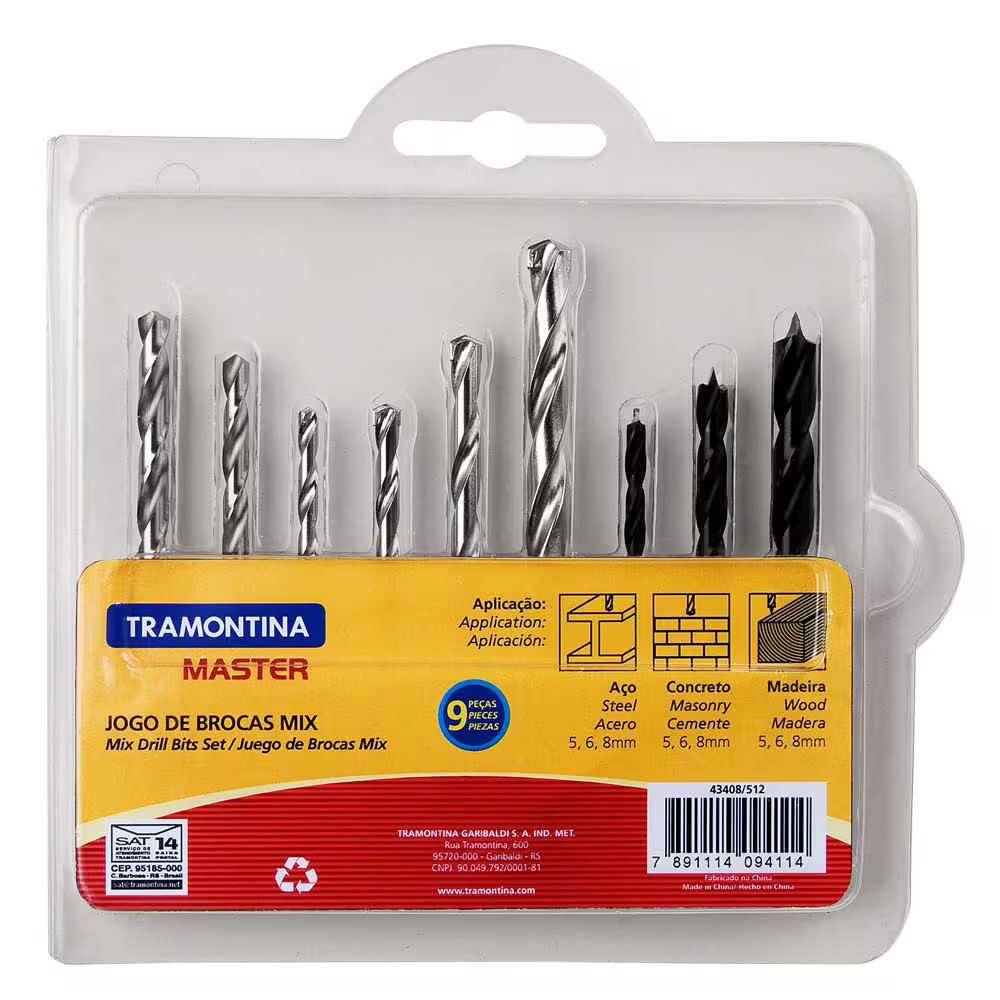 Kit Misto de Brocas 9 Peças para Madeira, Concreto e Aço Master Tramontina n/a