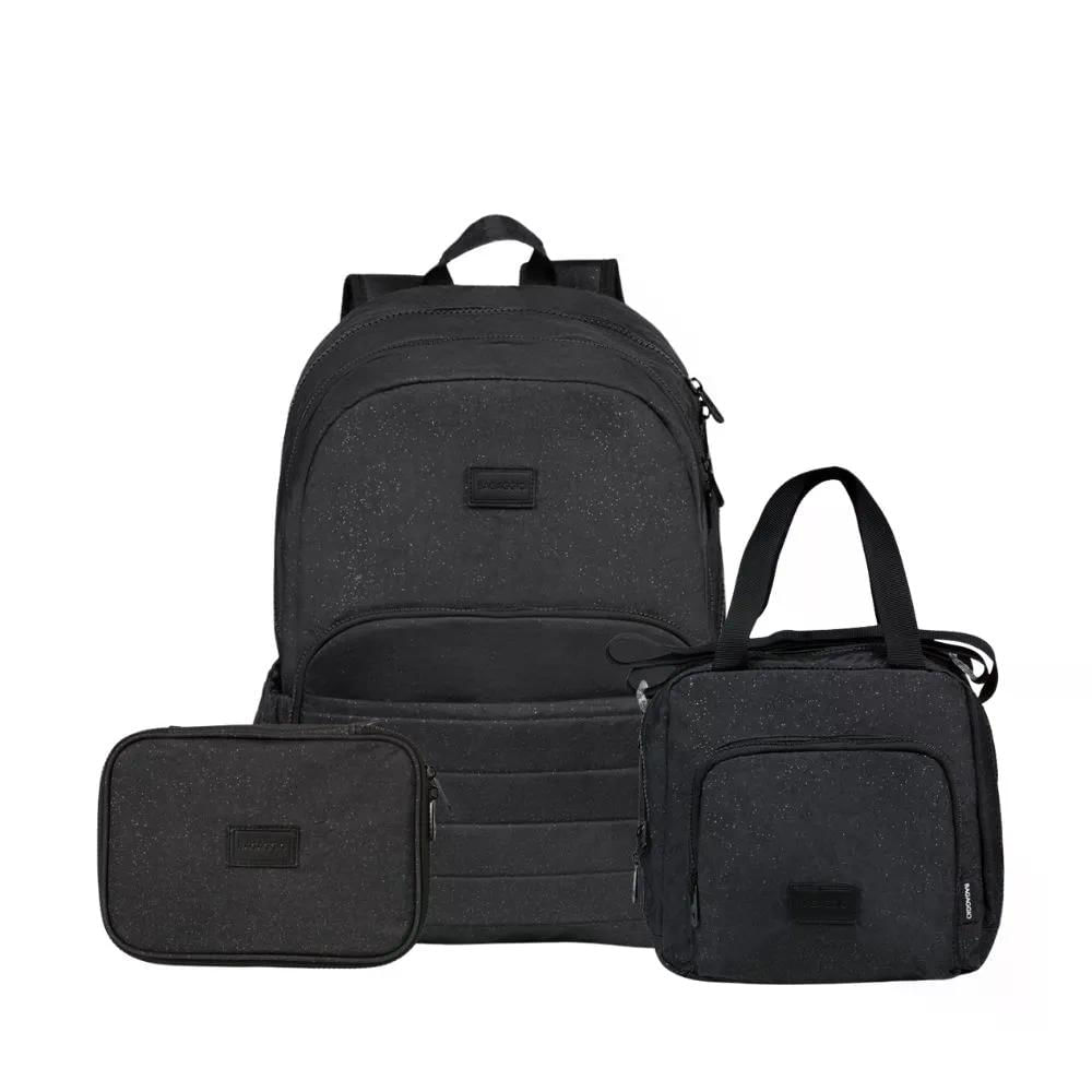 Com acabamento crinkle e detalhes em glitter, o kit traz um visual moderno e sofisticado, perfeito para o público juvenil. A mochila oferece ótimo espaço interno para livros, cadernos e materiais escolares, além de alças acolchoadas e ajustáveis, garantindo conforto no uso diário.A lancheira térmica ajuda a manter alimentos organizados e protegidos, ideal para a rotina escolar ou passeios. Já o estojo combinando facilita a organização de lápis, canetas e pequenos acessórios.