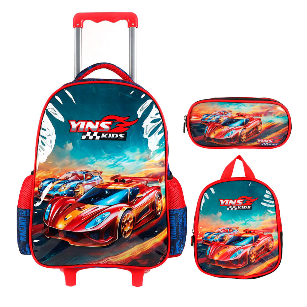 Kit Mochila com Rodinhas, Lancheira e Estojo Escolar Racing - Yins