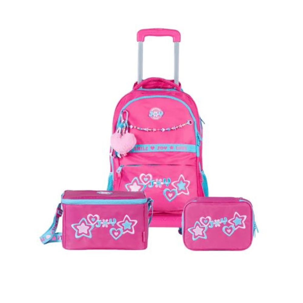 Kit Mochila de Rodinha Feminina + Lancheira Térmica + Estojo Box Juvenil BG Joy Rosa