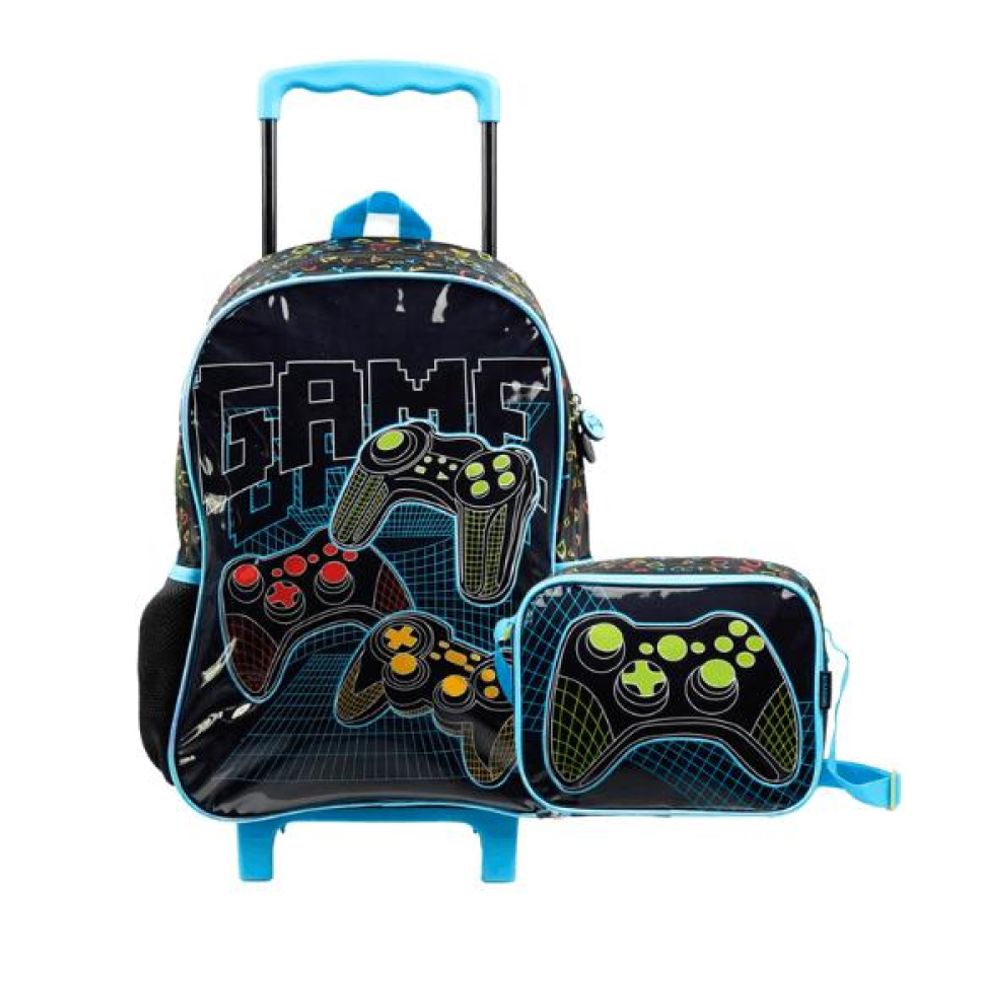 Kit Mochila de Rodinhas e Lancheira Térmica Masculina Video Game Preta