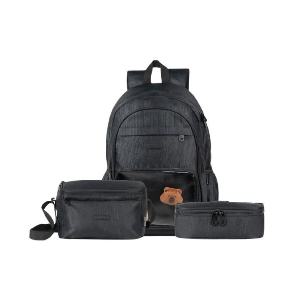 - Mochila com duas capivaras removíveis. - Lancheira é térmica. - Dois bolsos frontais pequenos. - Estojo com elásticos para organização de diversos materiais.