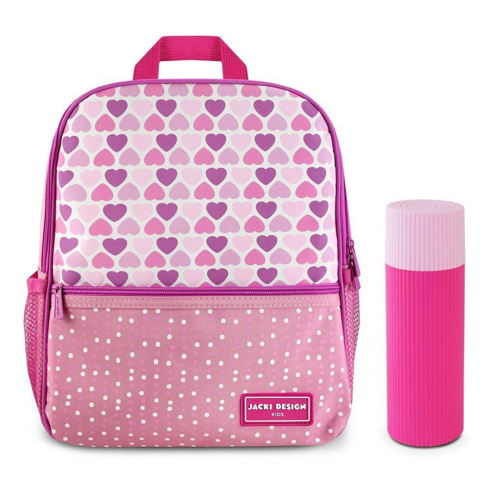 Kit Mochila Infantil + Porta Acessórios Jacki Design Coração Rosa -Kit Mochila Infantil Sapeka + Porta Acessórios Multiuso – Jacki DesignCombinando praticidade, organização e um visual encantador, este kit da linha Infantil da Jacki Design é ideal para acompanhar as crianças em passeios, viagens e no dia a dia. Com design alegre e funcional, reúne dois itens versáteis que ajudam a manter tudo no lugar com muito estilo!Mochila Infantil Sapeka:Perfeita para a rotina das crianças, a Mochila Sapeka traz uma estampa divertida e colorida, ideal para levar brinquedos, roupinhas, acessórios ou lanchinhos em passeios e atividades diárias. Confeccionada em microfibra resistente, possui alças acolchoadas e ajustável, bolso frontal com zíper e 2 bolsos laterais que ajudam na organização dos objetos e até garrafas de água.Medidas: 26,5 cm (C) x 10 cm (L) x 30 cm (A) Material: Microfibra Cuidados: Limpar com pano úmido; se necessário, utilizar sabão neutro ou álcool. Secar à sombra. Não lavar em máquina, não deixar de molho e não utilizar produtos químicos.Porta Acessórios MultiusoCompacto e versátil, é ideal para armazenar escova e pasta de dentes; lápis, caneta e itens escolares ou pequenos objetos pessoais. Perfeito para usar na escola, em viagens ou passeios.Medidas: 6 cm (C) x 6 cm (L) x 19 cm (A) Material: Polipropileno Dica: Este kit é uma ótima escolha para presentear ou organizar melhor o dia a dia dos pequenos com itens práticos, duráveis e cheios de charme!