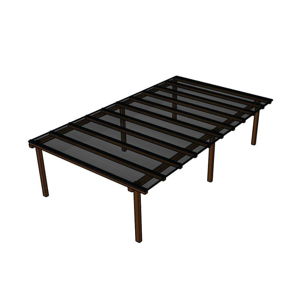 Como deve ser a estrutura5,00m de largura x 2,00m de avanço (sentido da caída da água)08 caibros/travessas (espaçamento de 70cm)caimento de 10%Considerando 08 pontos de fixaçãoAtenção para a fita VHB aderir bem a madeira, o topo do caibro precisa estar envernizado. Se a estrutura for em metal, basta esta bem limpa