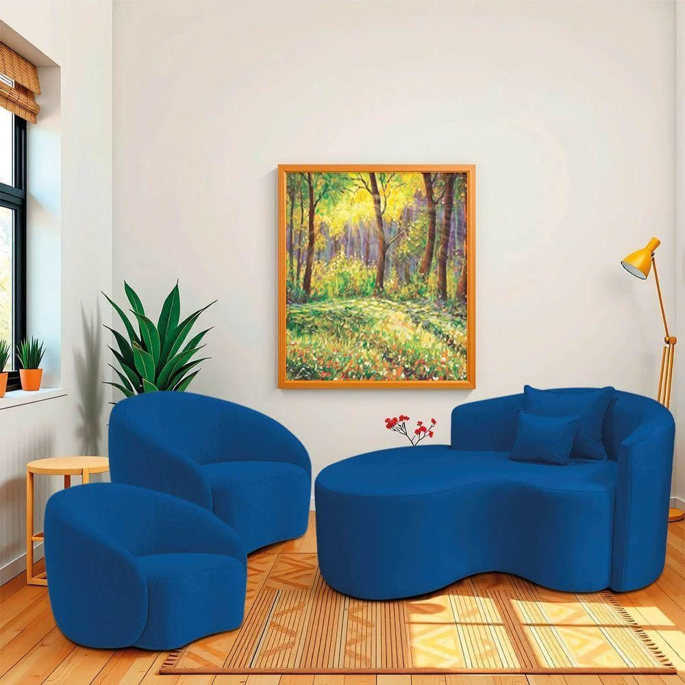 Kit Recamier Curvo Sala De Estar Inglaterra 150cm Lado Esquerdo E 2 Poltronas Orgânica Luxo Amore Linho Azul Royal