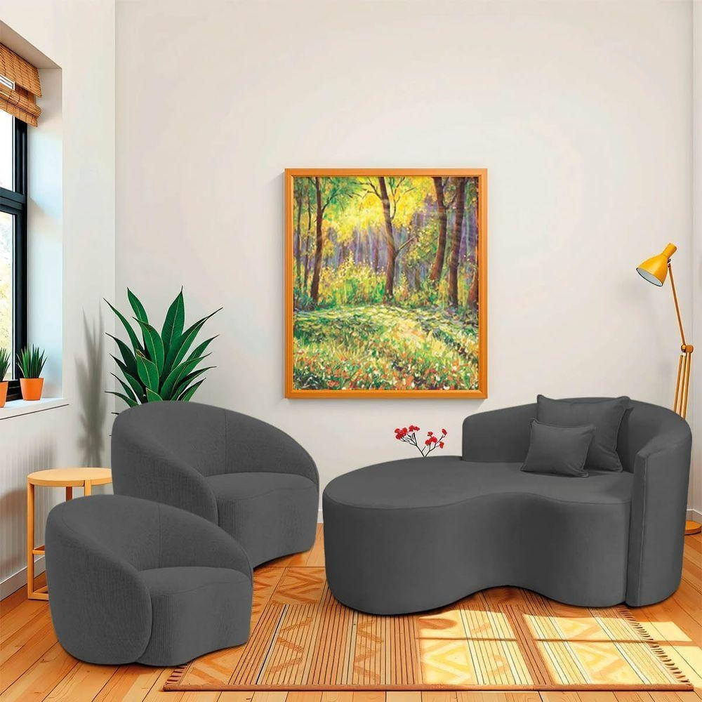Kit Recamier Curvo Sala De Estar Inglaterra 150cm Lado Esquerdo E 2 Poltronas Orgânica Luxo Amore Linho Cinza Escuro