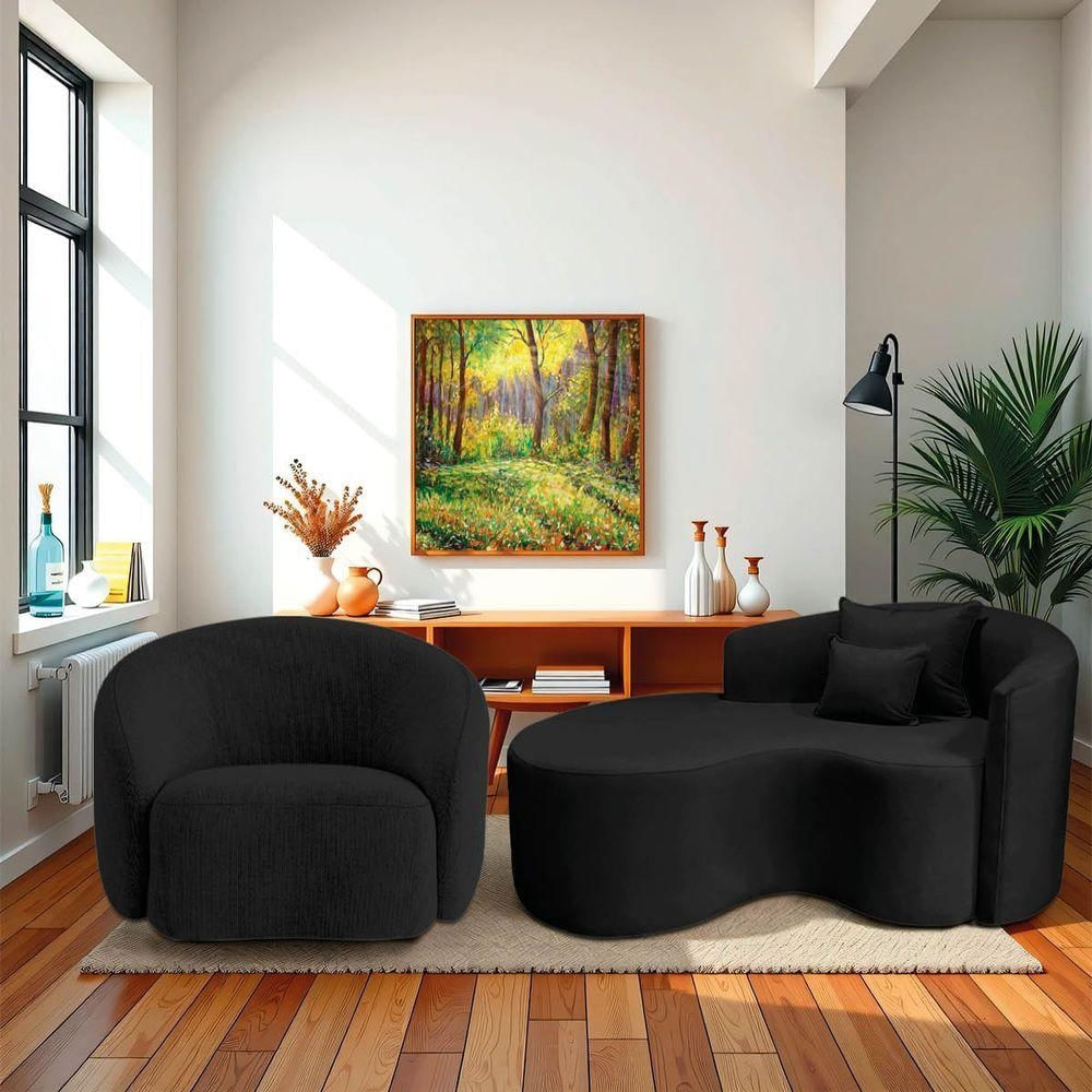 Kit Recamier Curvo Sala De Estar Inglaterra 150cm Lado Esquerdo E Poltrona Orgânica Luxo Amore Linho Preto