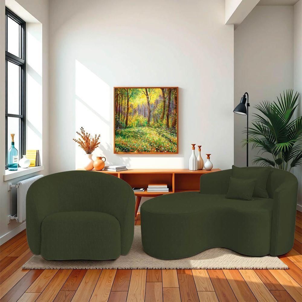 Kit Recamier Curvo Sala De Estar Inglaterra 150cm Lado Esquerdo E Poltrona Orgânica Luxo Amore Linho Verde