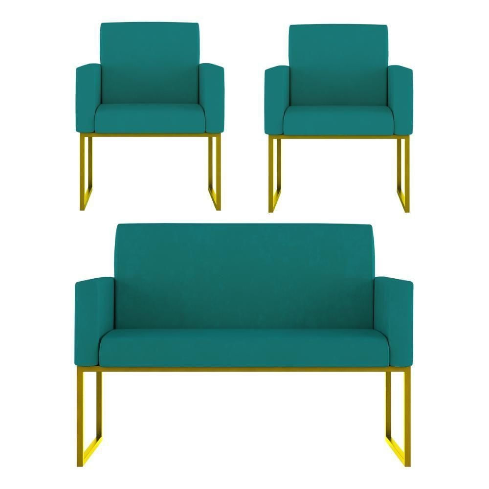 Kit Sofá 2 Lugares + 2 Poltronas Recepção Sala Base Dourada Cor:azul Turquesa Azul Turquesa