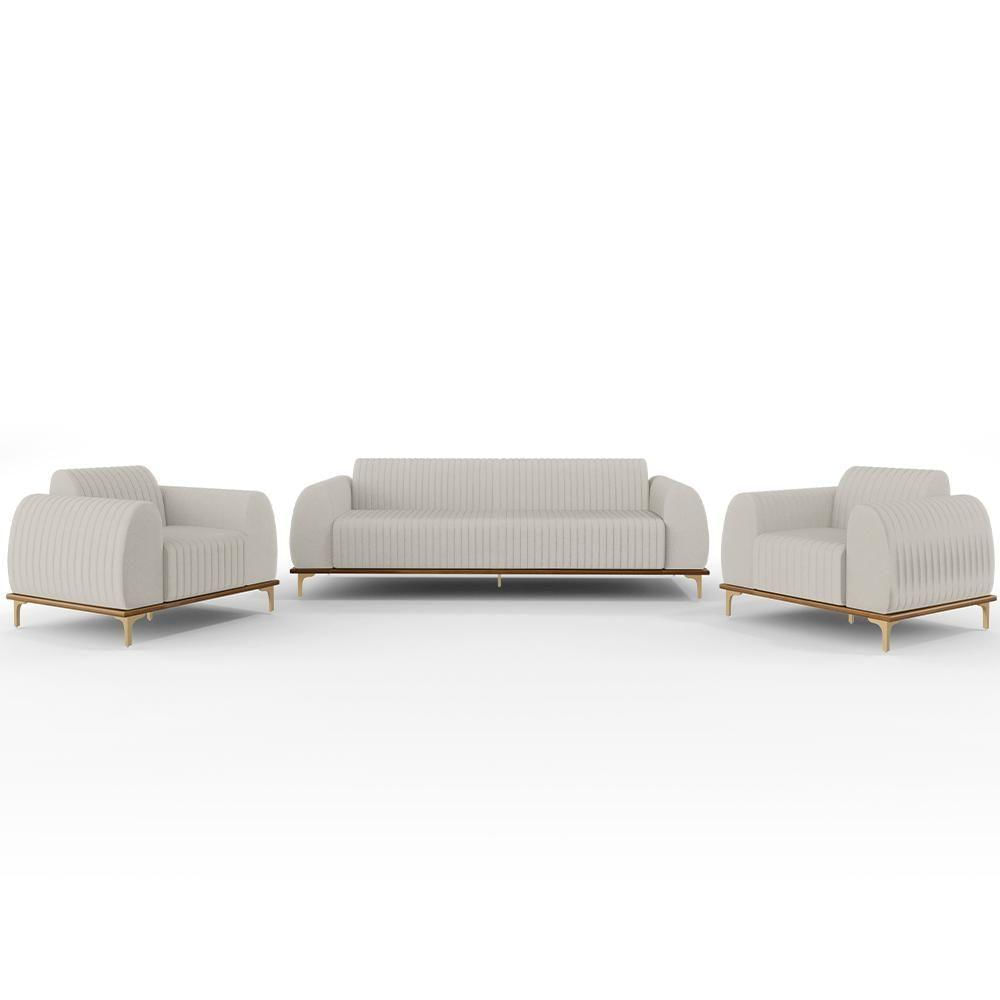 Kit Sofá 3 Lugares 180cm Com 2 Poltronas Molino Pés D'ouro D02 Linho Cru C-443 - Lyam Decor