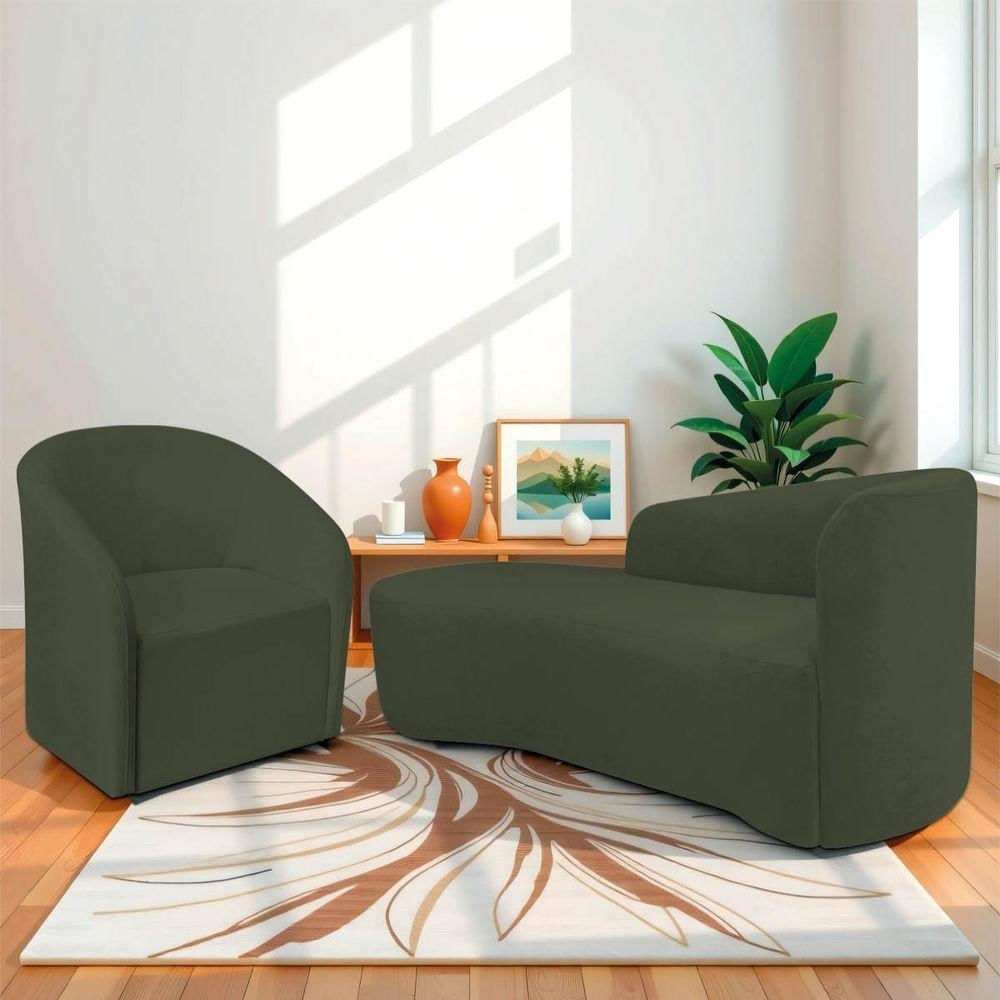 Kit Sofá Curvo França 140cm L.e E Poltrona Luiza Max Conforto, Elegância E Design Moderno Linho Verde