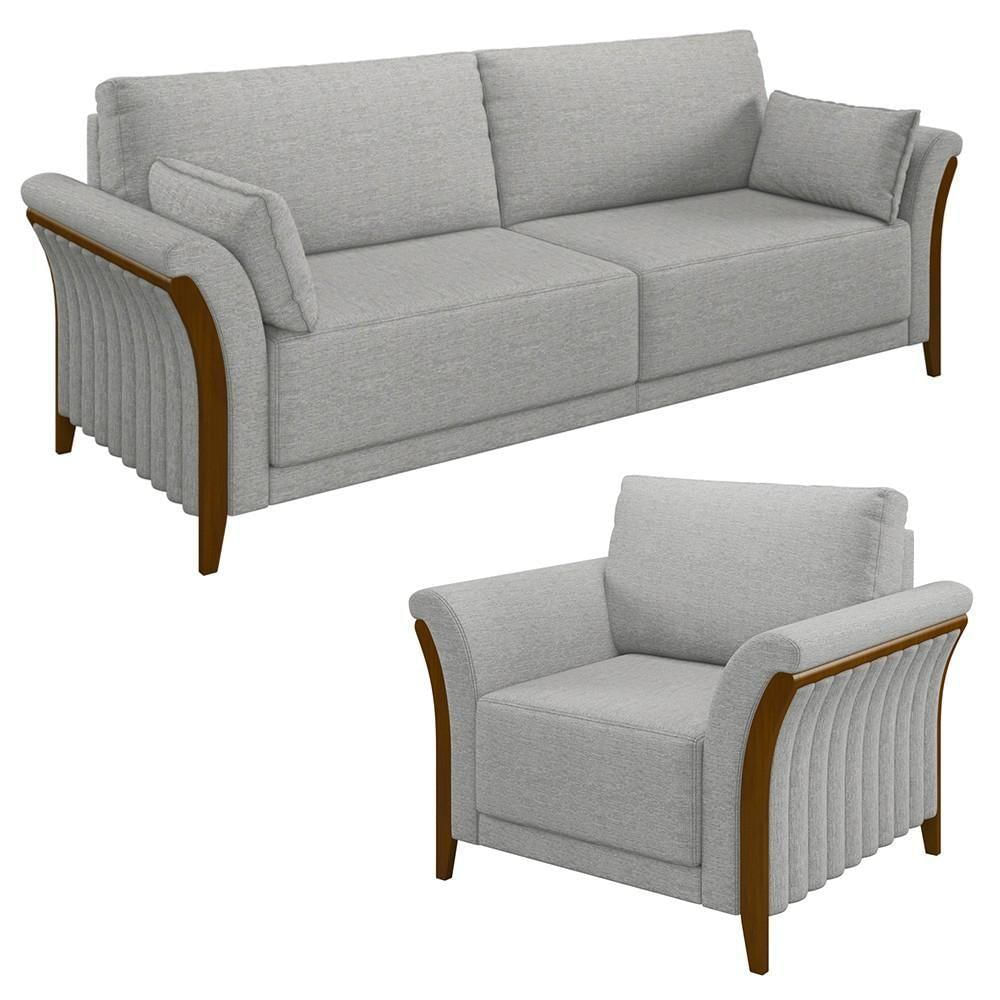 Kit Sofá Living 3 Lugares E Poltrona 102cm Pés Madeira Roya M22 Linho Cinza - Mpozenato
