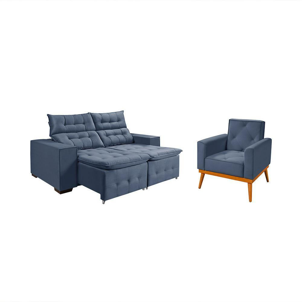 Kit Sofá Retratil Reclinável Bari 1,90 Pillow Mais Poltrona Florença Em Veludo Denin Azul