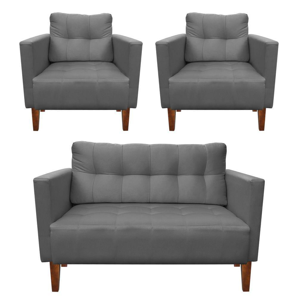 Kit Sofá Retrô Namoradeira 2 Lugares e 02 Poltronas Livia Suede Grafite - D'Rossi Junção de conforto e design moderno, é uma ótima escolha para sua casa, recepção ou em qualquer outro ambiente. Possui preenchimento em espuma de excelente qualidade, densidade D26 no acento e nos braços, no encosto fibra siliconada e revestimento em suede. Estrutura em madeira reflorestada e percintas elásticas, que garantem durabilidade e alta resistência. Dimensões