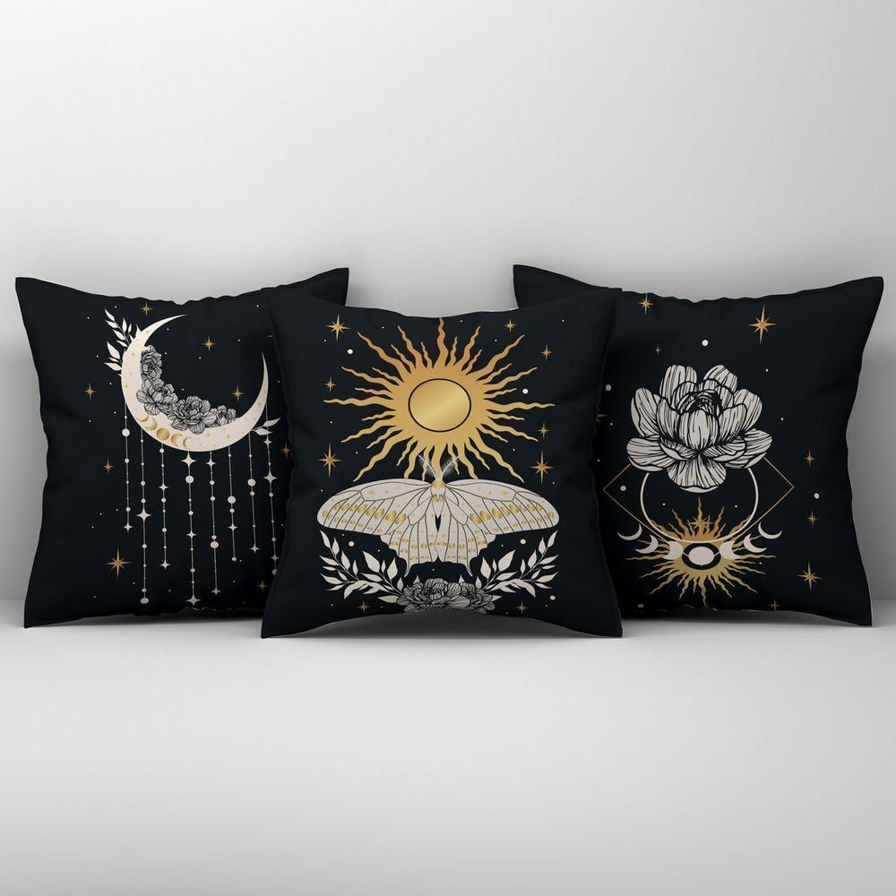 Kit Trio Capas De Almofadas Estampadas Fases Da Lua Em Veludo Suede 45cm X 45cm - Decoração Luxo Para Sala Cor Preto
