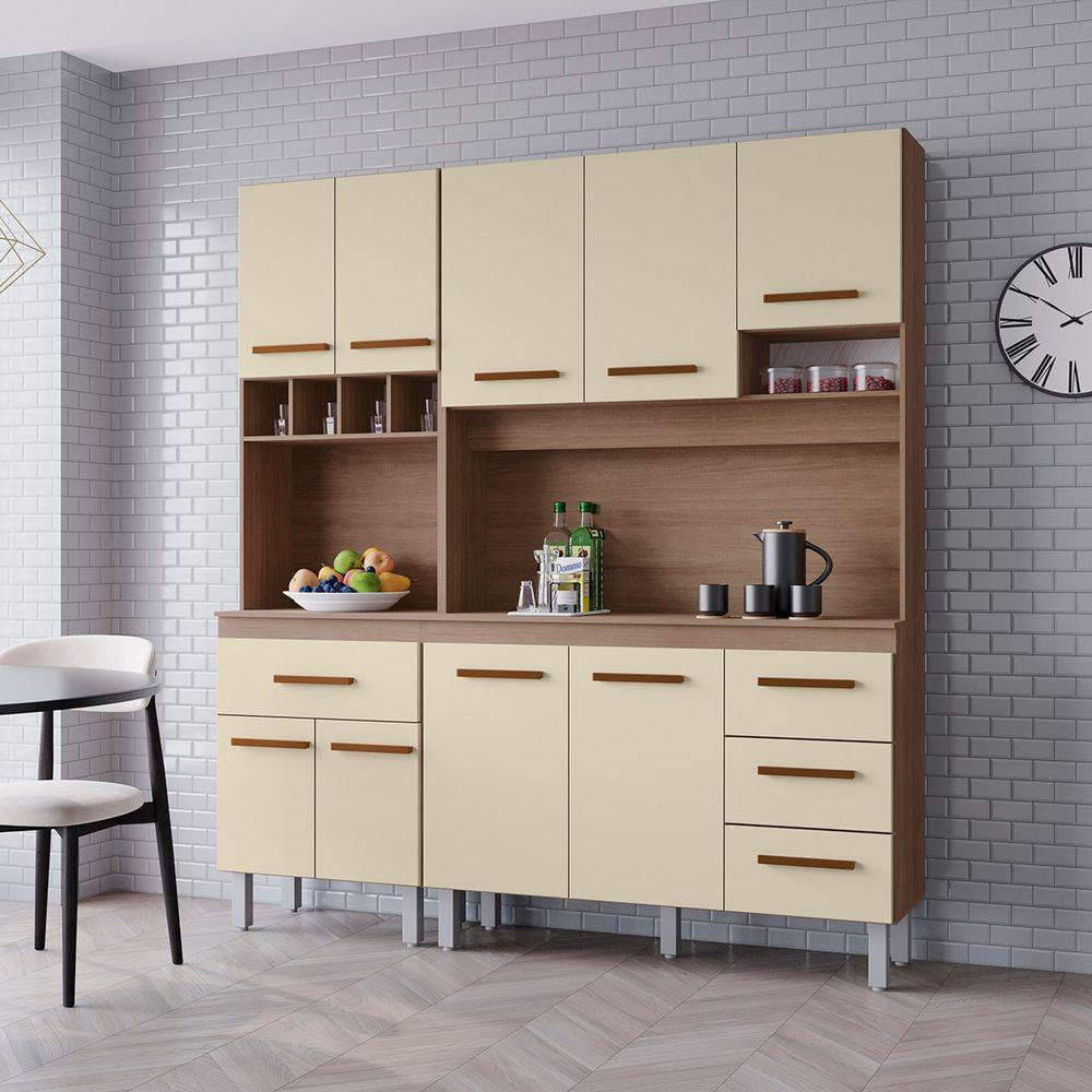 Kit Zínia Com Paneleiro 9 Portas 4 Gavetas Cozinha Mb1 180cm Cor Savana Off White