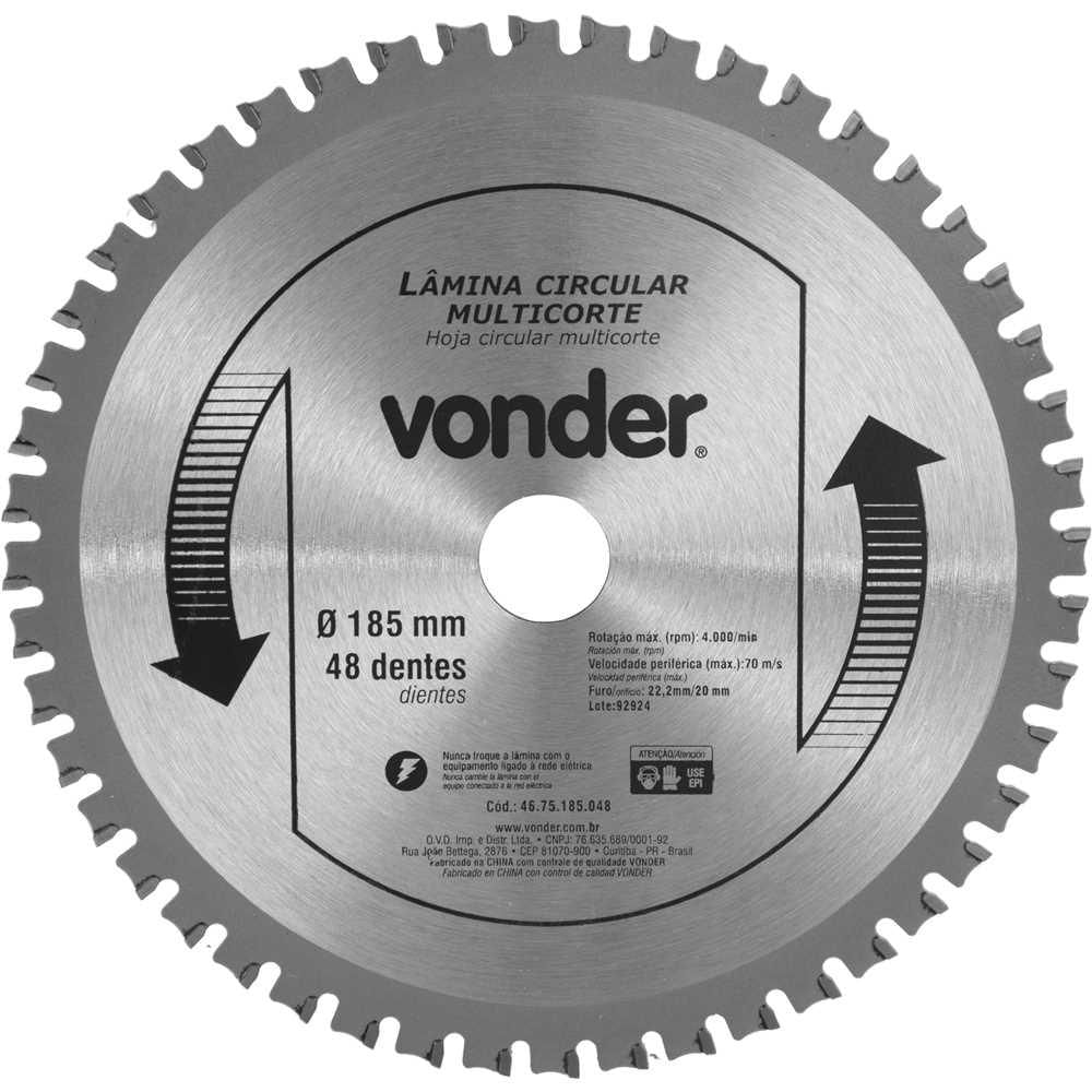 Indicada para cortar madeira, plásticos, alumínio, bronze, baquelite e gesso. Utilizada em serra circular, acompanha bucha de redução para furo de 20 mm. Possui dentes de metal duro (vídea) que possibilitam o corte de vários materiais sem precisar trocar a lâmina. Diâmetro da lâmina: 185 mm | Diâmetro do furo da lâmina: 22,2 mm / 20,0 mm | Espessura de corte: 1,6 mm | Espessura do corpo da lâmina: 1,1 mm | Número de dentes da lâmina: 48 dentes | Rotação máxima do disco - rpm: 6.200/min | Velocidade periférica (máx.): 60 m/s | Massa aproximada (peso) (kg): 0,25 kg