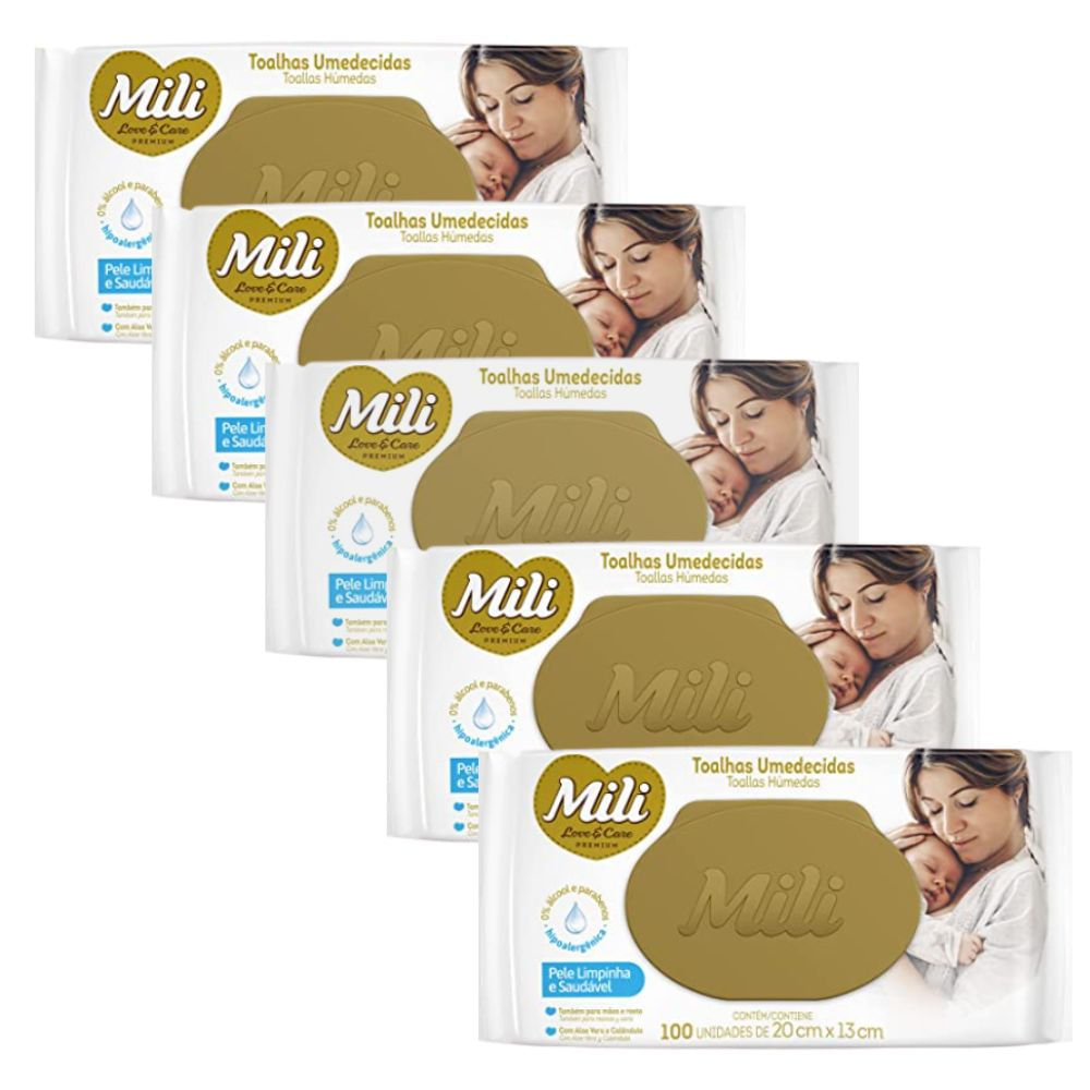 Lenço Umedecido Mili Love & Care 5 Pacotes c/100 (total 500 Toalhinhas )super macias, sem álcool, sem parabenos