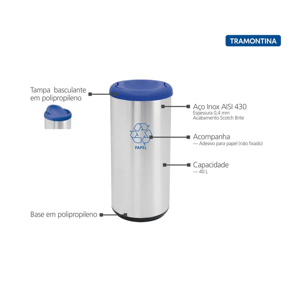Com a Lixeira Inox Tramontina Cápsula Selecta Plus Basculante com Acabamento Scotch Brite e Tampa Basculante Azul em Polipropileno 40 L, você tem um produto ideal para ambientes domésticos, comerciais ou de grande circulação de pessoas, escolas, restaurantes, supermercados, shopping centers e outros, possibilitando a separação correta do lixo. Além disso, vem com um adesivo azul para indicar o descarte de papel. Com ela, você cuida de qualquer ambiente com muito mais facilidade.