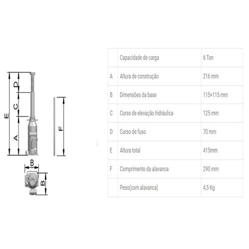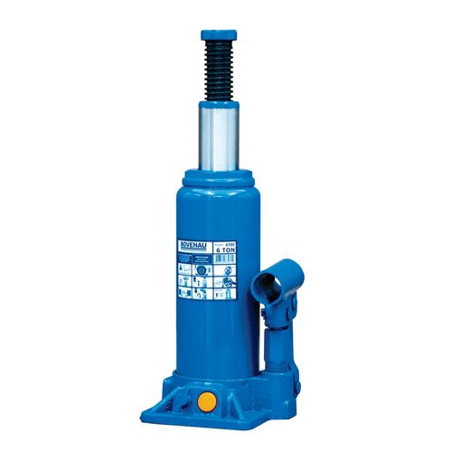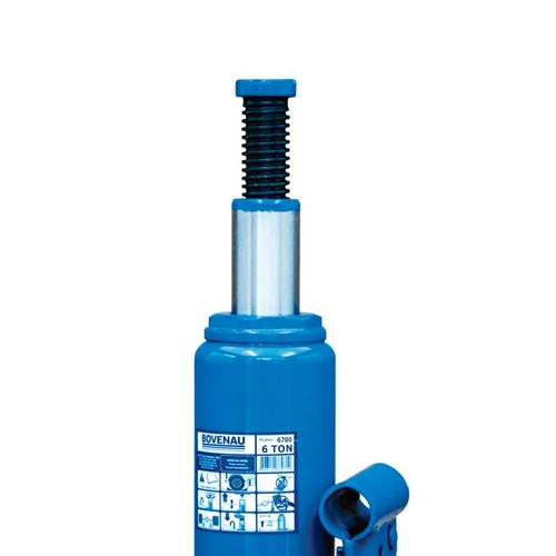 Macaco Hidráulico Tipo Garrafa 6700 – CJ6   A solução perfeita para suas necessidades de elevação e suporte! Estes macacos hidráulicos da renomada marca Bovenau são a escolha ideal para facilitar suas atividades em oficinas, garagens e até mesmo em emergências na estrada. Com capacidade de carga de até 6000kg, você pode confiar na sua resistência e eficiência para levantar carros, caminhonetes e outros veículos com facilidade e segurança.   Seja você um profissional da mecânica ou um entusiasta automotivo, nossos Macacos Hidráulicos são um investimento confiável e durável, projetado para atender às mais altas demandas de desempenho. Com seu design compacto e operação intuitiva, você poderá executar tarefas com agilidade e precisão.   Não arrisque sua segurança com ferramentas inferiores! A BOVENAU possui uma das maiores linhas de macacos hidráulicos tipo garrafa do mercado global.   Todos os macacos podem ser usados na horizontal desde que a catraca ou a bomba pneumática esteja na posição inferior.   Características Técnicas:   Linha: Automotiva Modelo: 6700 – CJ6 Capacidade de carga: 6 t Altura de construção: 216 mm Dimensões da base: 115X115 mm Curso de elevação hidráulica: 125 mm Curso de Fuso: 70 mm Altura total: 415 mm Comprimento da alavanca: 290 mm Peso (com alavanca): 4,5 kg