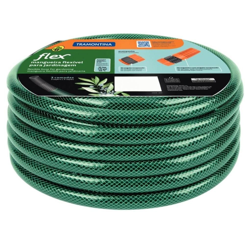 Mangueira de jardim Tramontina Flex de 20m na cor verde, resistente, com estrutura trançada e reforçada com 3 camadas de PVC que garante maior durabilidade e flexibilidade no uso diário. Projetada para suportar pressão constante sem torções ou dobras, assegura fluxo contínuo e confiável. Acompanha engate rosqueado, que proporciona conexão firme à torneira, reduzindo vazamentos, e esguicho com regulagem de jato, permitindo desde irrigação suave de plantas até limpeza eficiente de áreas externas. Solução tradicional, robusta e funcional para jardinagem e manutenção residencial, com padrão de qualidade Tramontina e foco em desempenho operacional.