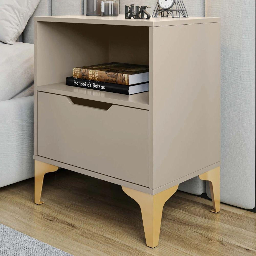 Organize o quarto com a mesa de cabeceira Mesa de Cabeceira Moderna Gaveta Nicho Corrediça Telescópica Puxador Cava Cor Off White Pés Dourado Estrutura Durável, ideal para apoiar itens de uso diário ao lado da cama. Com estrutura em MDF e acabamento em pintura UV, oferece praticidade e resistência para a rotina. A gaveta com corrediça telescópica e puxador cava mantém objetos pessoais bem guardados, enquanto o nicho frontal aberto acomoda livros, eletrônicos e itens decorativos sempre à mão. Os pés de aço com sapatas plásticas elevam o móvel, facilitando a limpeza e protegendo o piso. Versátil e de estilo moderno, combina facilmente com diferentes propostas de decoração de quarto.