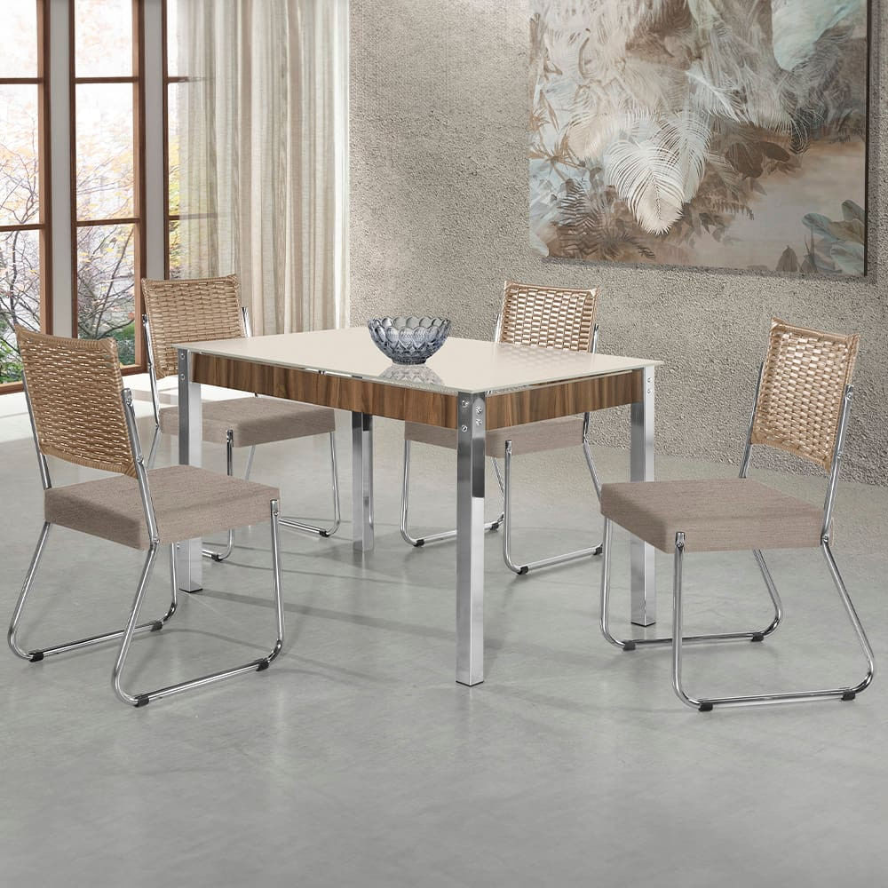 Mesa de Jantar Aço Nobre Claudia com Tampo Kanon e 4 Cadeiras Bege/Nogal/Off White