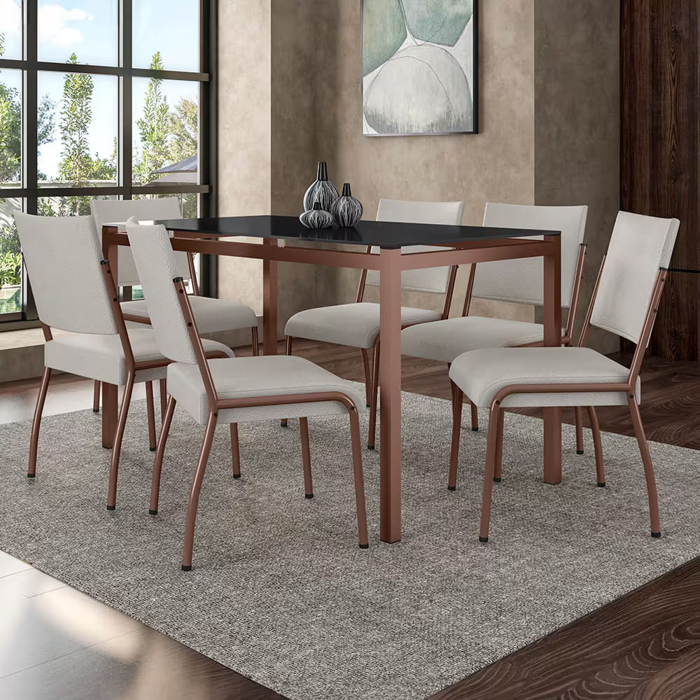Características Gerais: Cor predominante: Bege, Marrom, Preto, Branco Material: Aço Carbono Acabamento: Epóxi Estrutura: Encosto e assento com espuma Formato da mesa: Retangular Mesa com tampo de vidro: Sim Tampo de vidro: 140 x 80 cm Espessura do vidro: 08mm Quantidade de cadeiras: 6 cadeiras Assento com espuma: Sim Encosto com espuma: Sim Revestimento: Courino Densidade do encosto: D14 Capacidade de peso da cadeira: até 100kg